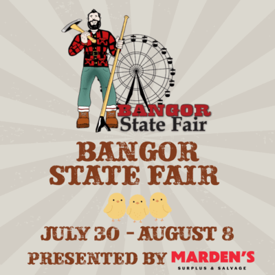 Bangor State Fair 2026 More Info Presented by Marden's Jul 30 Thursday 4:00 PM – 10:00 PM Buy Tickets Jul 31 Friday 4:00 PM – 10:00 PM Buy Tickets Aug 1 Saturday 12:00 PM – 10:00 PM Buy Tickets Aug 2 Sunday 12:00 PM – 8:00 PM Buy Tickets Aug 3 Monday 4:00 PM – 10:00 PM Buy Tickets Aug 4 Tuesday 4:00 PM – 10:00 PM Buy Tickets Aug 5 Wednesday 4:00 PM – 10:00 PM Buy Tickets Aug 6 Thursday 4:00 PM – 10:00 PM Buy Tickets Aug 7 Friday 4:00 PM – 10:00 PM Buy Tickets Aug 8 Saturday 12:00 PM – 10:00 PM Buy Tickets